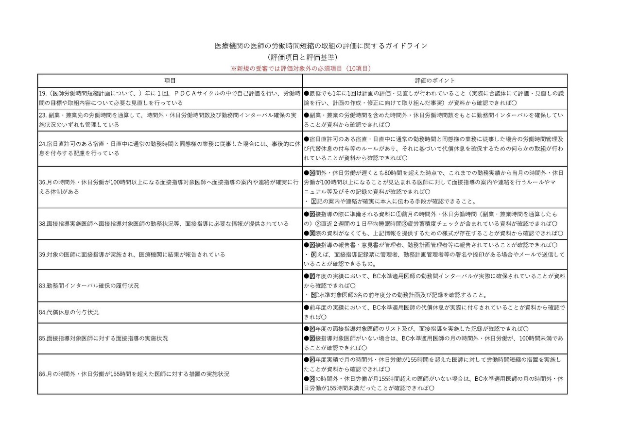 新規指定の受審における必須項目を遵守することはもちろんですが、新規指定の際には評価対象外であった必須項目が10項目あり、特に、副業・兼業先の労働時間を通算した、時間外・休日労働時間数及び勤務間インターバル・代償休息の確保や、長時間労働医師に対する面接指導については、これまで経験したことのない新しいオペレーションであり、4月から円滑に始め、指定更新に必要な記録を適正に残すためにも、ぜひ事前にシミュレーションをされておくことをお勧めいたします。